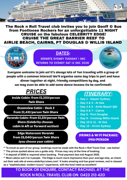 We’re hosting a cruise to the Great Barrier Reef in December 2026 on board the spectacular Celebrity Edge ship, and we’d love our Rock n Roll dance family to join us! Everyone is welcome — dancers, partners, friends and cruise lovers alike. We already have 15 paid deposits and details have only been released recently!