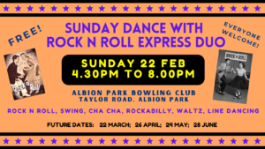 The next Sunday afternoon Rock n Roll social dance will be held on SUNDAY 22ND FEBRUARY 2026. These dances are a great way to meet your fellow students and practice your dance moves. The time is 4.30pm to 8pm and the band is the ROCK N ROLL EXPRESS DUO who play a great range of songs including Rock n Roll, Cha Cha, Line Dancing etc.